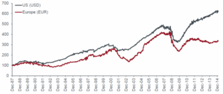 Europäische Aktien zählen zu den Standard Asset-Klassen in der industrialisierten Welt. Seit dem Aufkeimen der Staatsschuldenkrise wurde das Umfeld allerdings deutlich ruppiger. Vor allem im Vergleich zu den anderen entwickelten Märkten.
