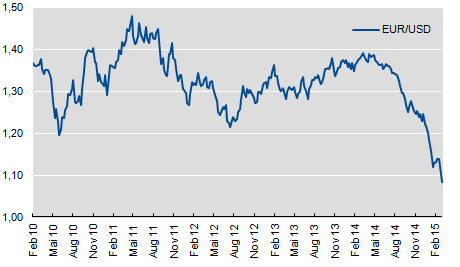 Seit Anfang 2014 hat der Euro gegenüber dem US-Dollar rund 30% an Wert verloren (siehe Grafik). Diese Tatsache wirkt wie eine Konjunkturspritze, da exportorientierte Firmen an den Weltmärkten somit einen erheblichen Vorteil in der Preisgestaltung aufweisen.