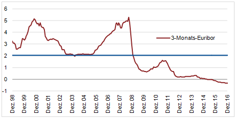 Die Grafik zeigt, dass erst mit Ausbruch der europäischen Schuldenkrise Werte unter 2% erreicht wurden - davor waren Werte zwischen 2% und 5% "normal".