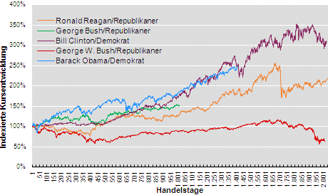 - Ein Ausblenden der Politik bei den Börsenentscheidungen macht durchaus Sinn. Obwohl die Republikaner als arbeitgeberfreundlich gelten, sind deren Präsidenten weitaus weniger erfolgreich an der Börse als ihre demokratischen Pendants. Obama wandelt auf Clintons erfolgreichen Börsenspuren!