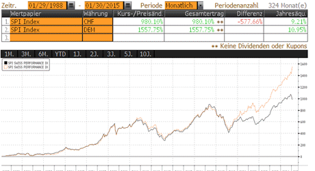 Wie folgender Chart des Swiss Performance Index ("SPI") zeigt, konnten die Schweizer Unternehmen (aktuell beinhaltet der Index über 300 Unternehmen) inklusive Dividende sowohl in Schweizer Franken wie auch in Euro eine ansprechende Rendite über die mehr als 25 Jahre erzielen und damit Werte für Aktionäre schaffen. Die rote Linie zeigt den SPI in DEM/EUR und die schwarze Linie in der Heimatwährung CHF.